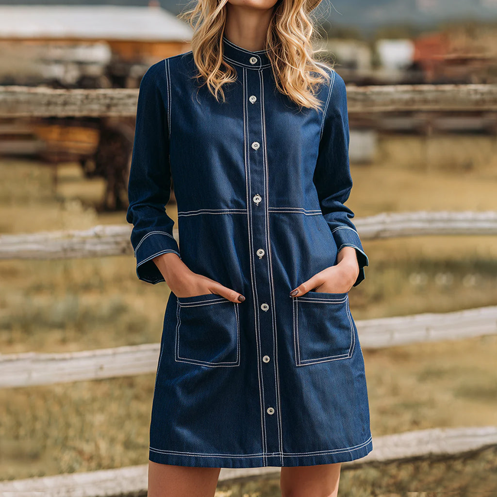Stand Collar Button Patch Pockets Contrast Stitching Denim Mini Dress