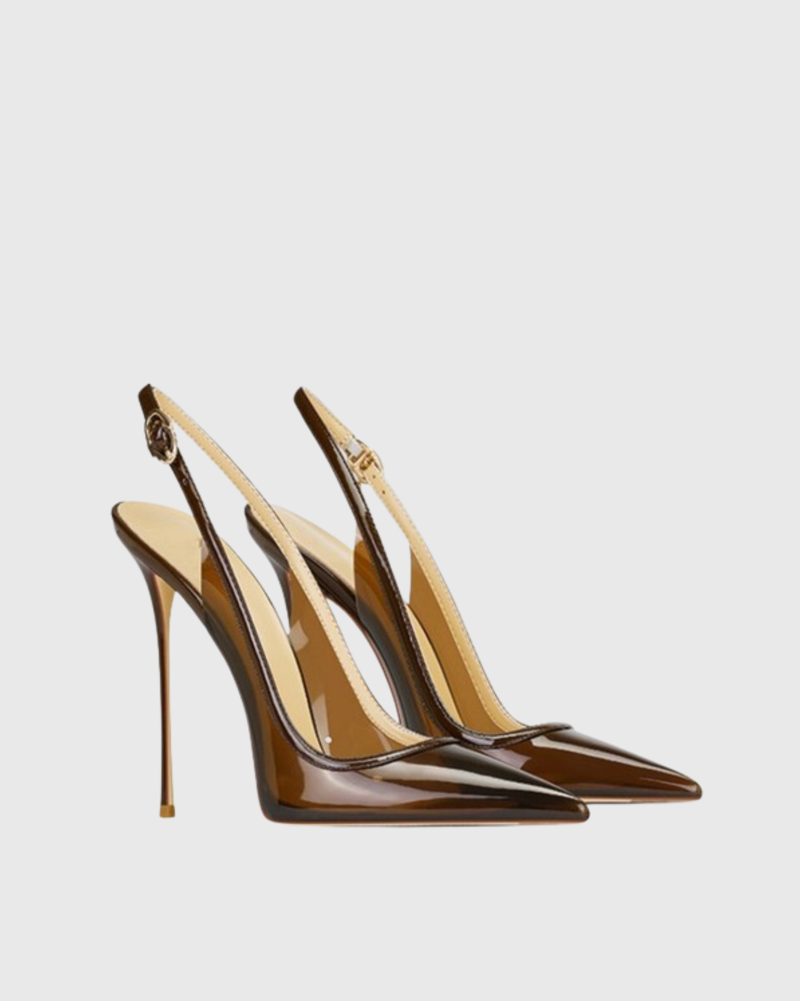 Step into elegance with the Sylvie PVC Slingback Pumps in Brown. These chic pumps combine transparent PVC with a warm brown tone, offering a modern twist on classic style. The slingback design ensures a secure, comfortable fit, perfect for all-day wear. Elevate your outfit effortlessly with these versatile heels that blend sophistication and contemporary flair.