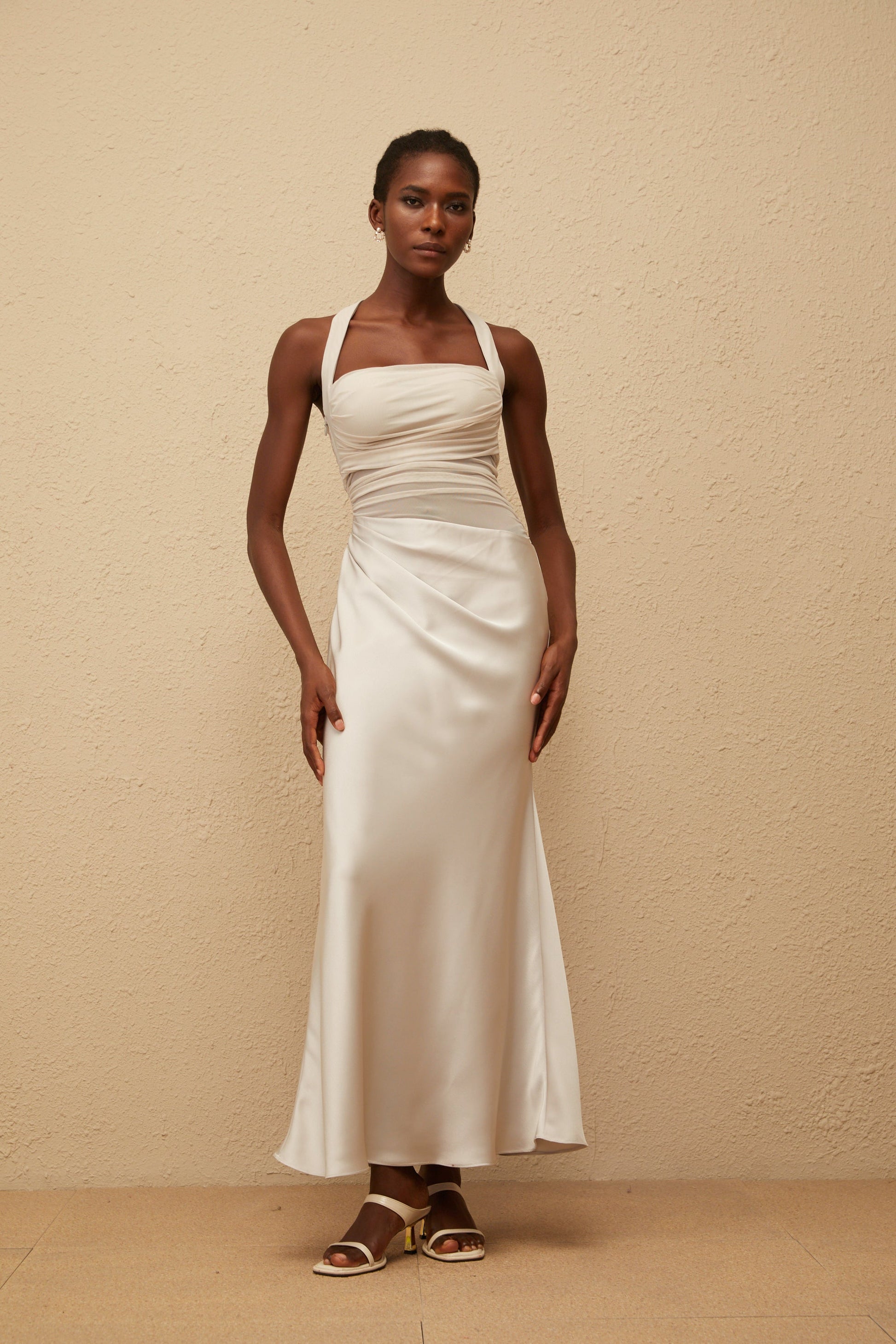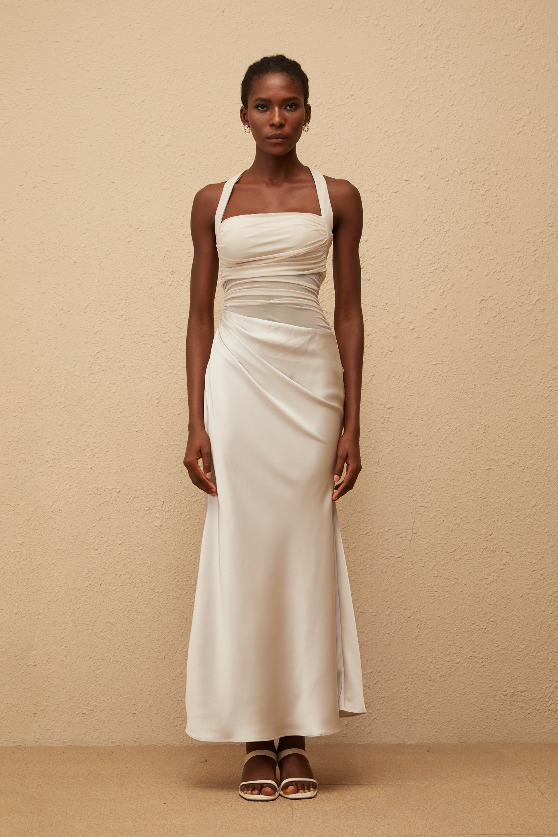 Taina Grey Mesh Panel Ruched Maxi Dress