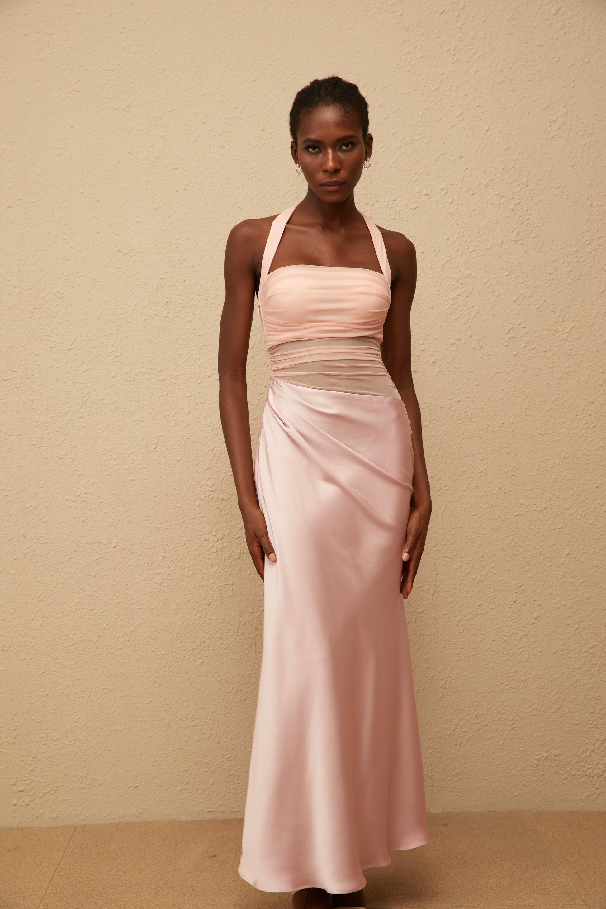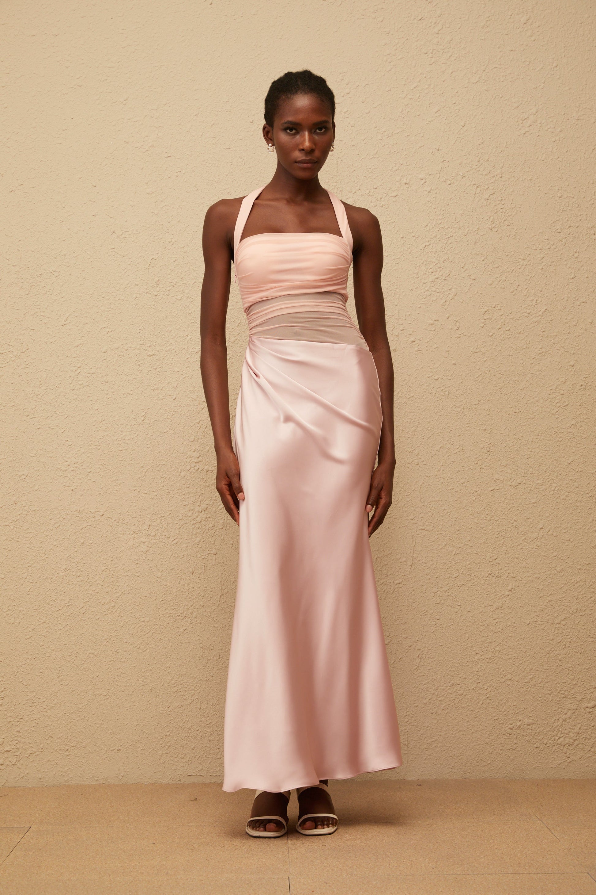 Taina Pink Mesh Panel Ruched Maxi Dress