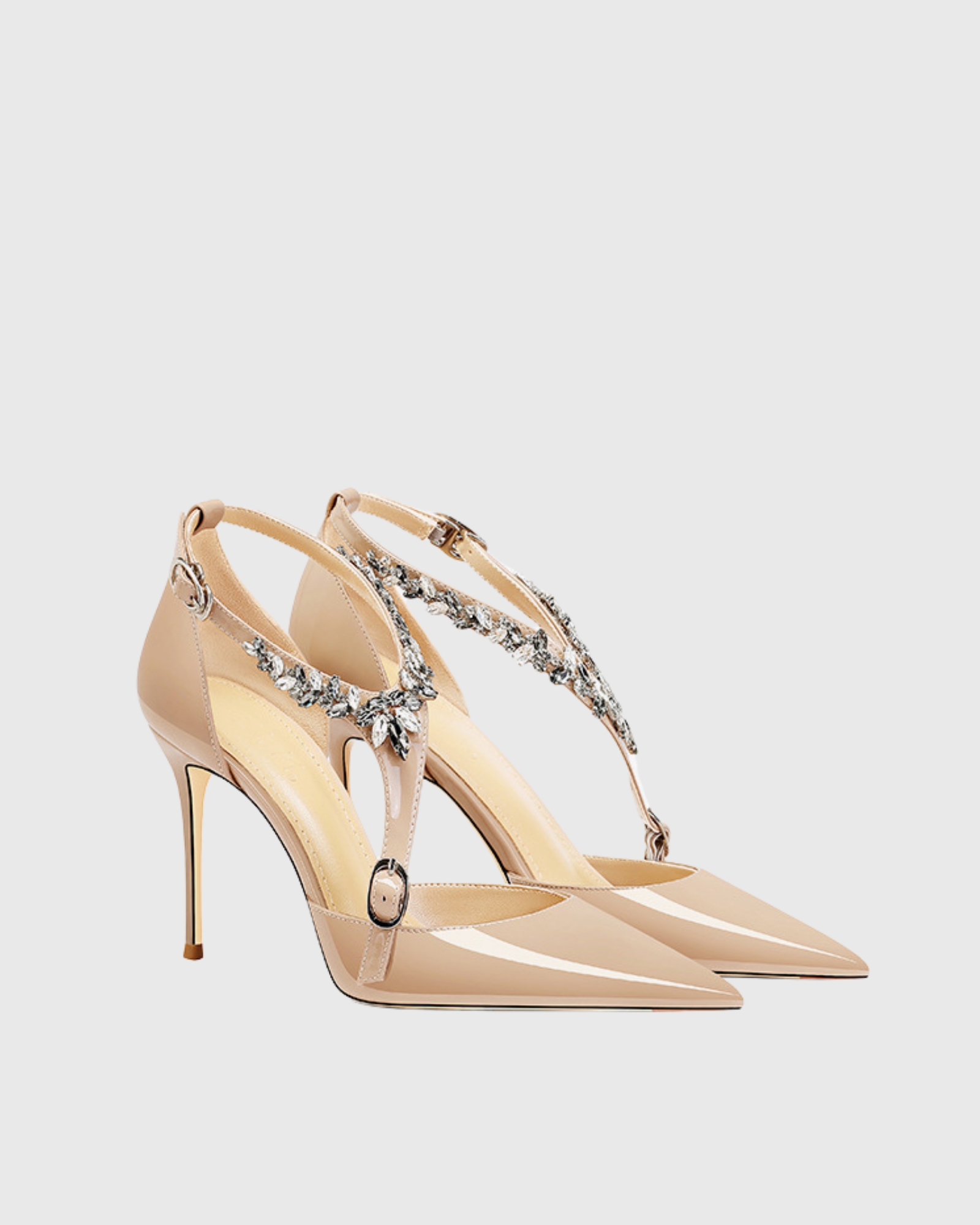 Teagan Rhinestone Halter Neck Strap Pumps In Beige