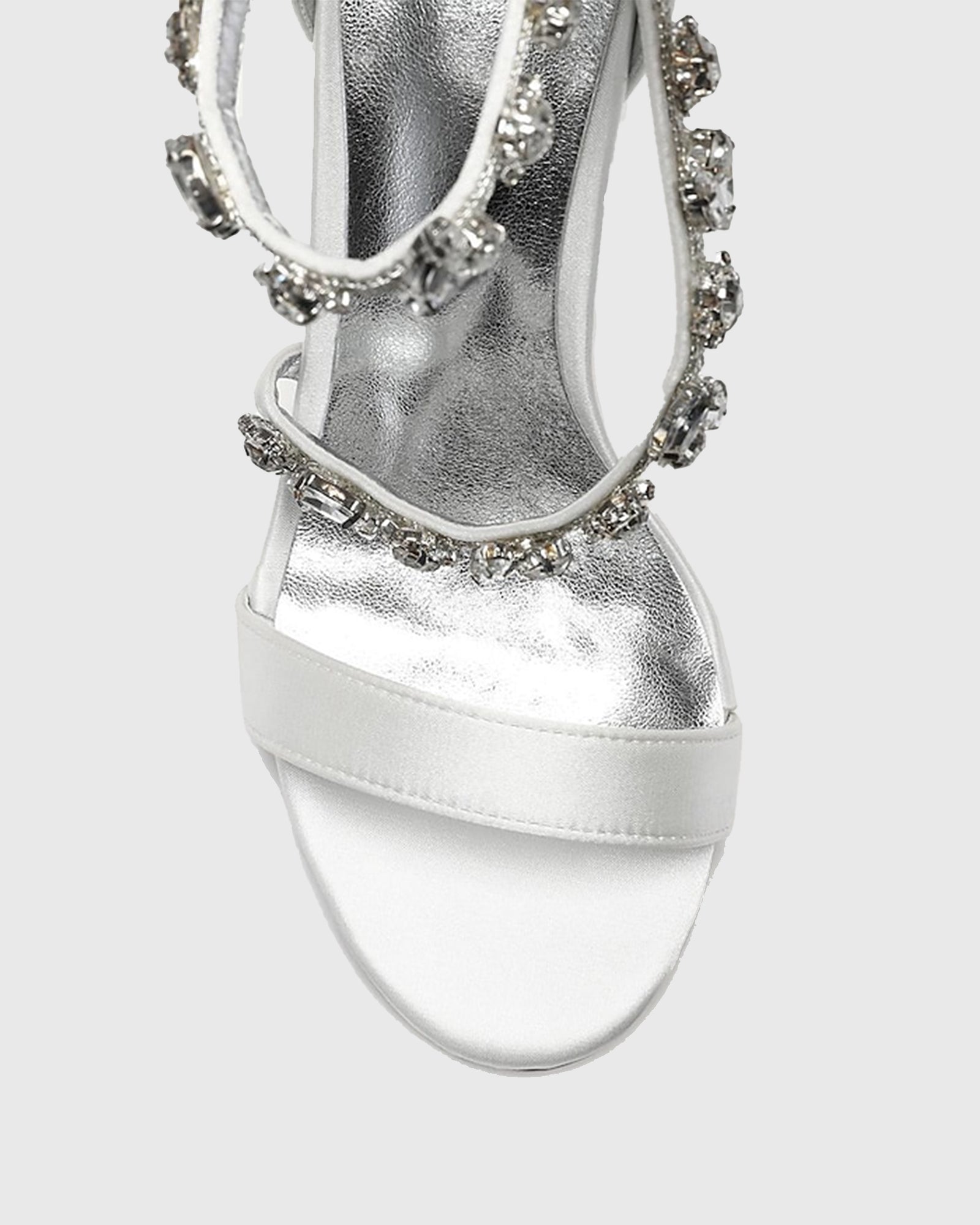 Elevate your look with the Teofila Rhinestone Satin Sandals in Ivory. The elegant satin material is adorned with sparkling rhinestones, adding a touch of glamour to any outfit. Slip into these sandals and feel confident and stylish with every step. Perfect for special occasions or adding a touch of luxury to your everyday wardrobe.