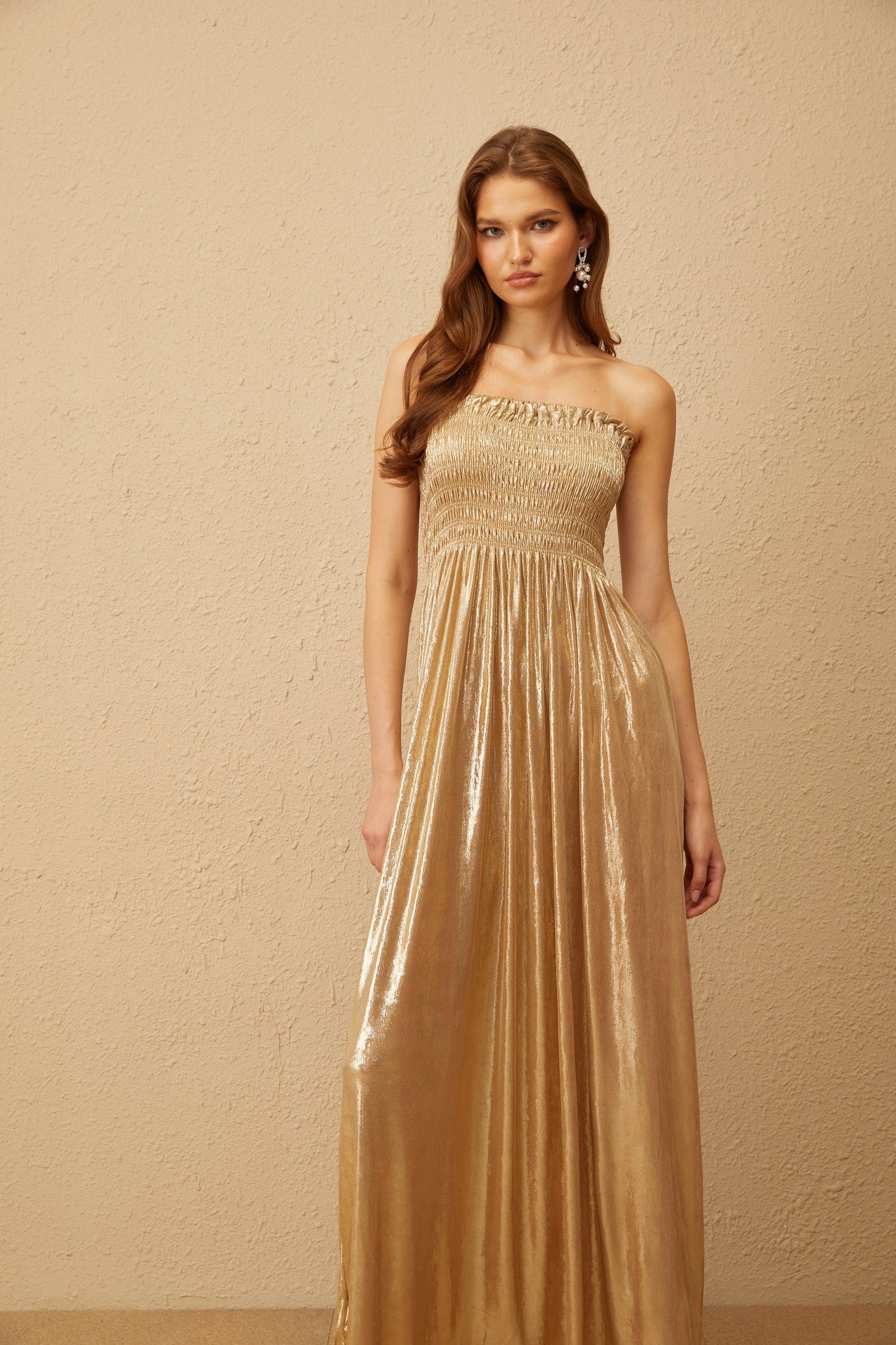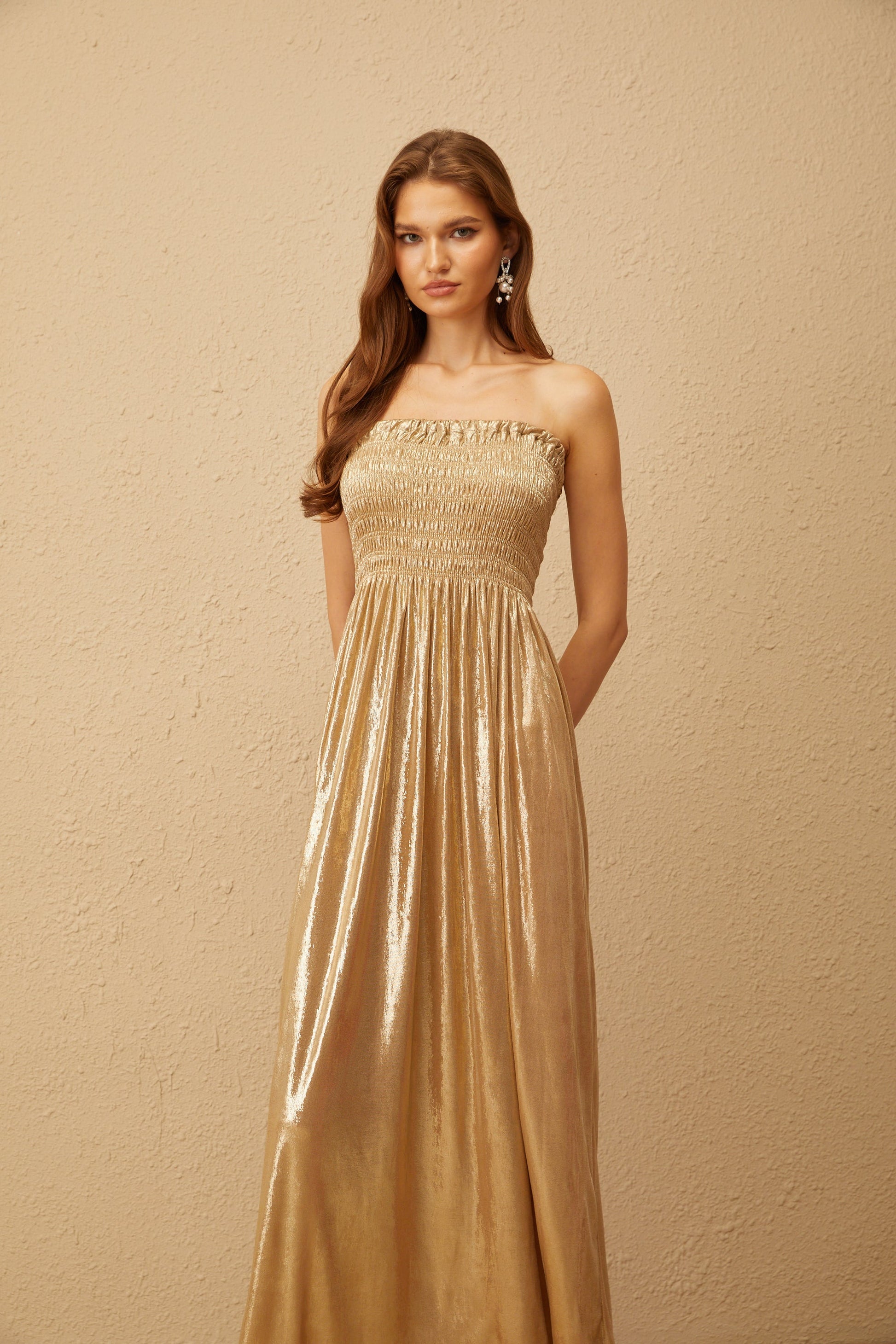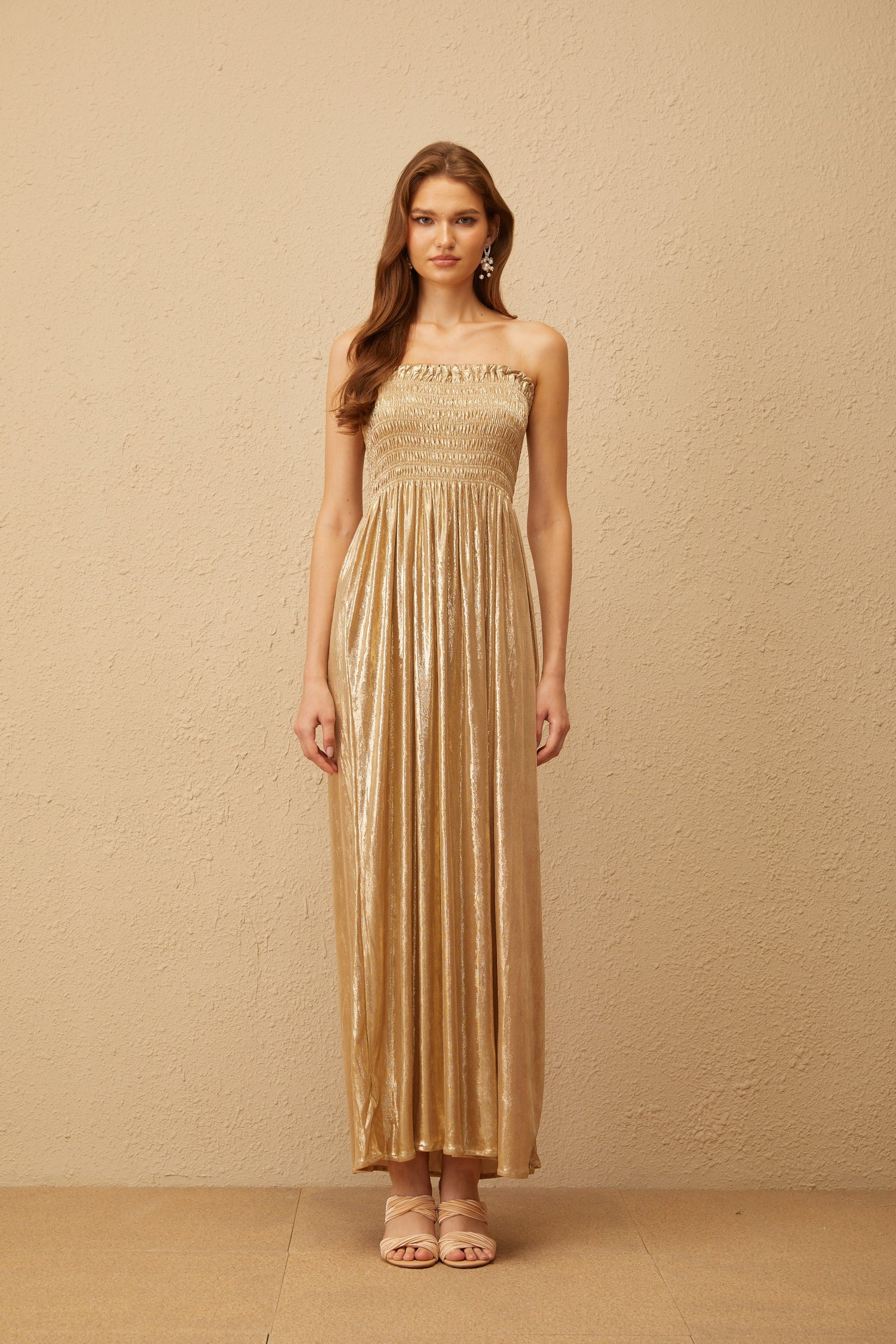 Tiphaine Gold Glossy Smocked Panel Midi Dress
