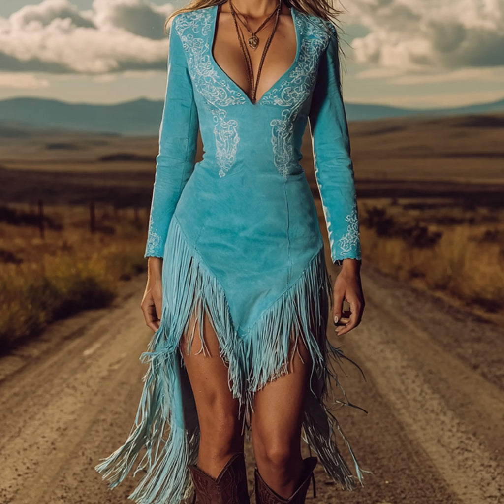 Ursime Deep V Neck Long Sleeve Floral Fringe Suede Mini Dress