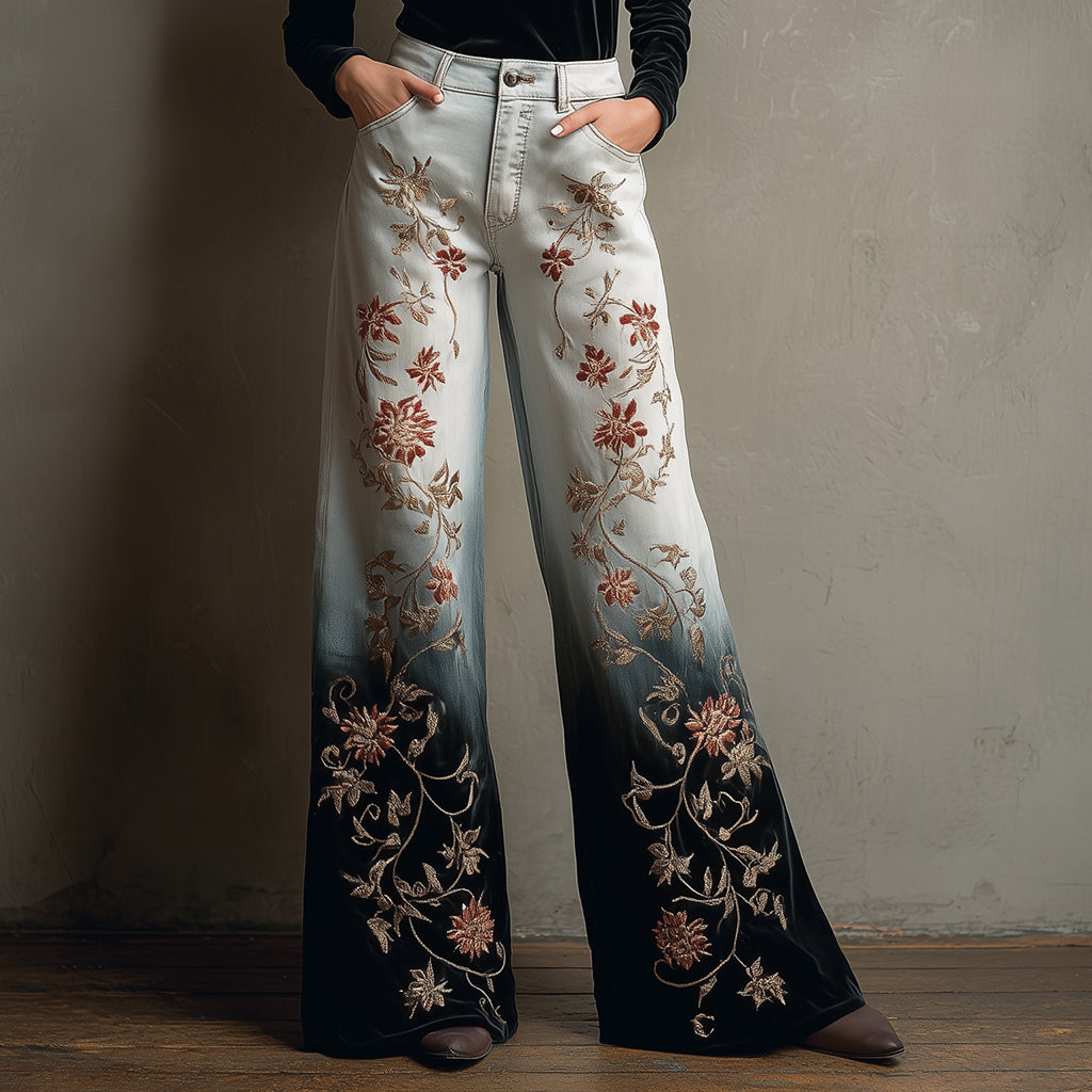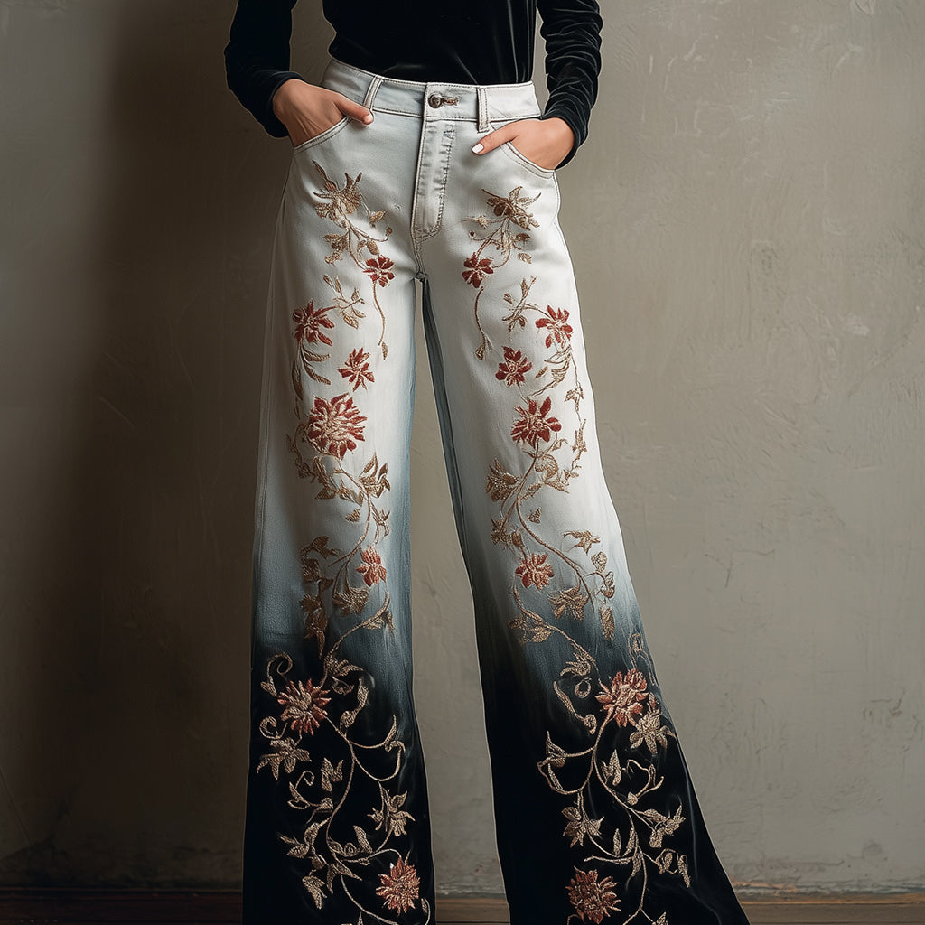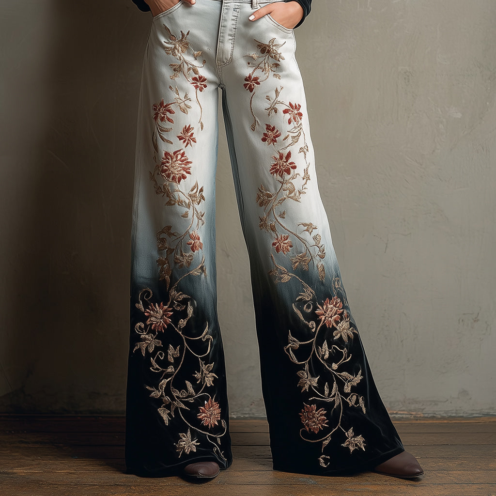 Ursime Floral Leaf Denim-Like Print Ombre Wide Leg Pants
