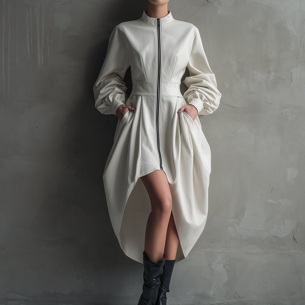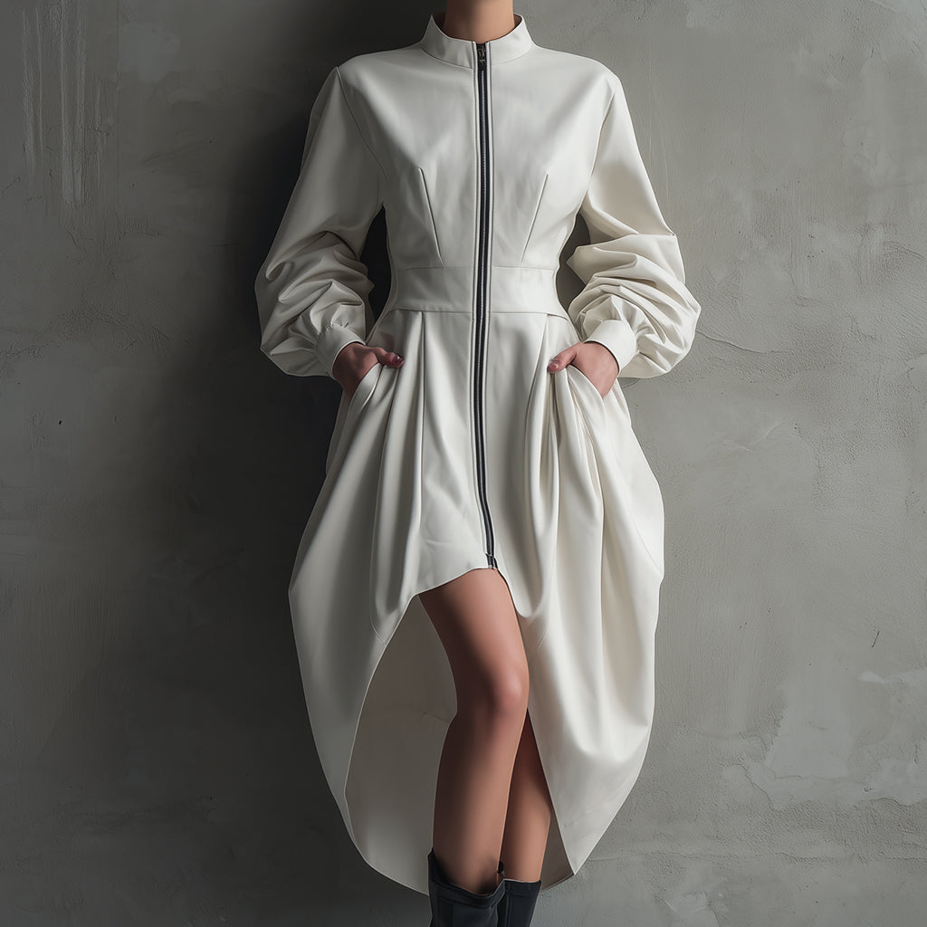 Details: Lantern Sleeve, Pockets, Zipper, High-Low Hem
