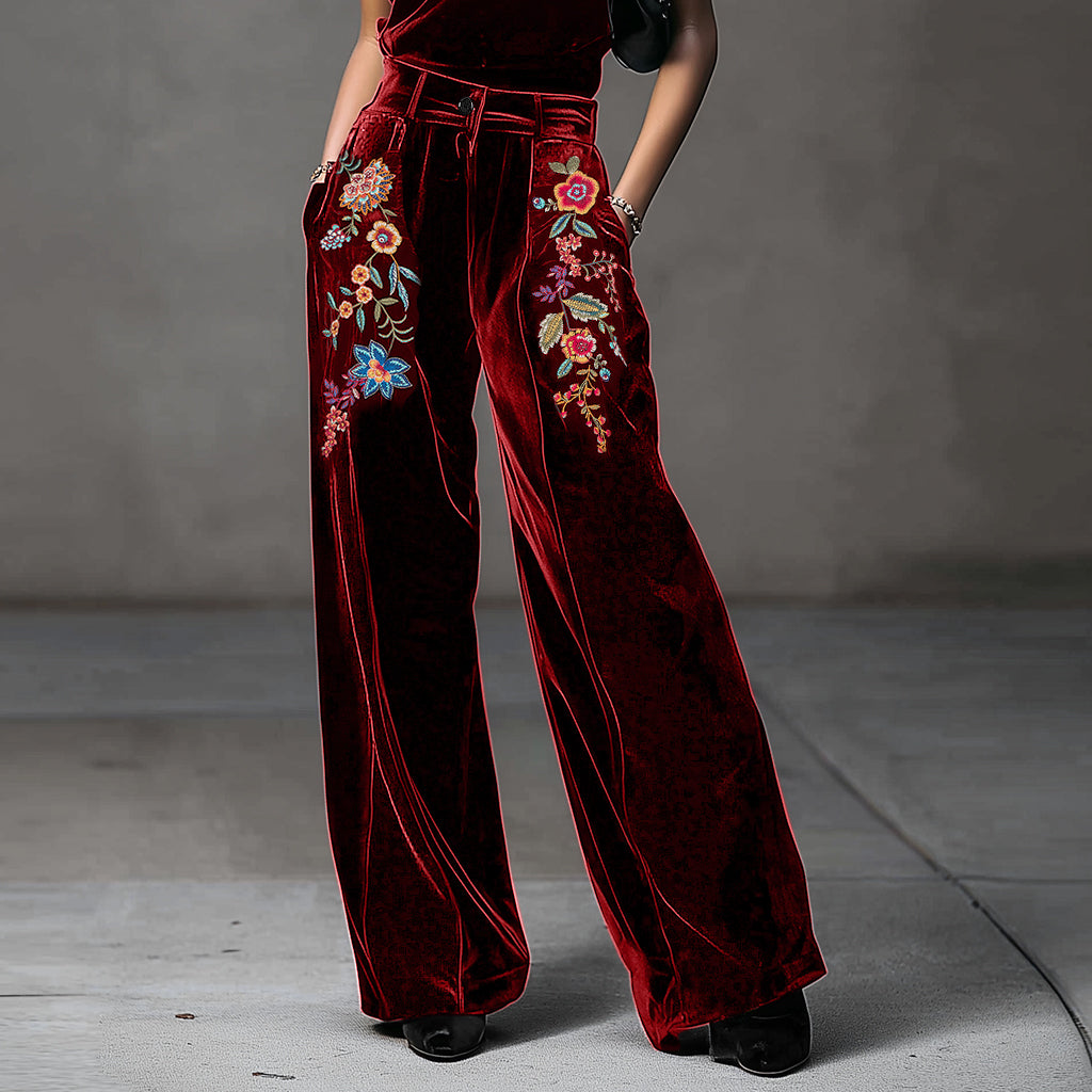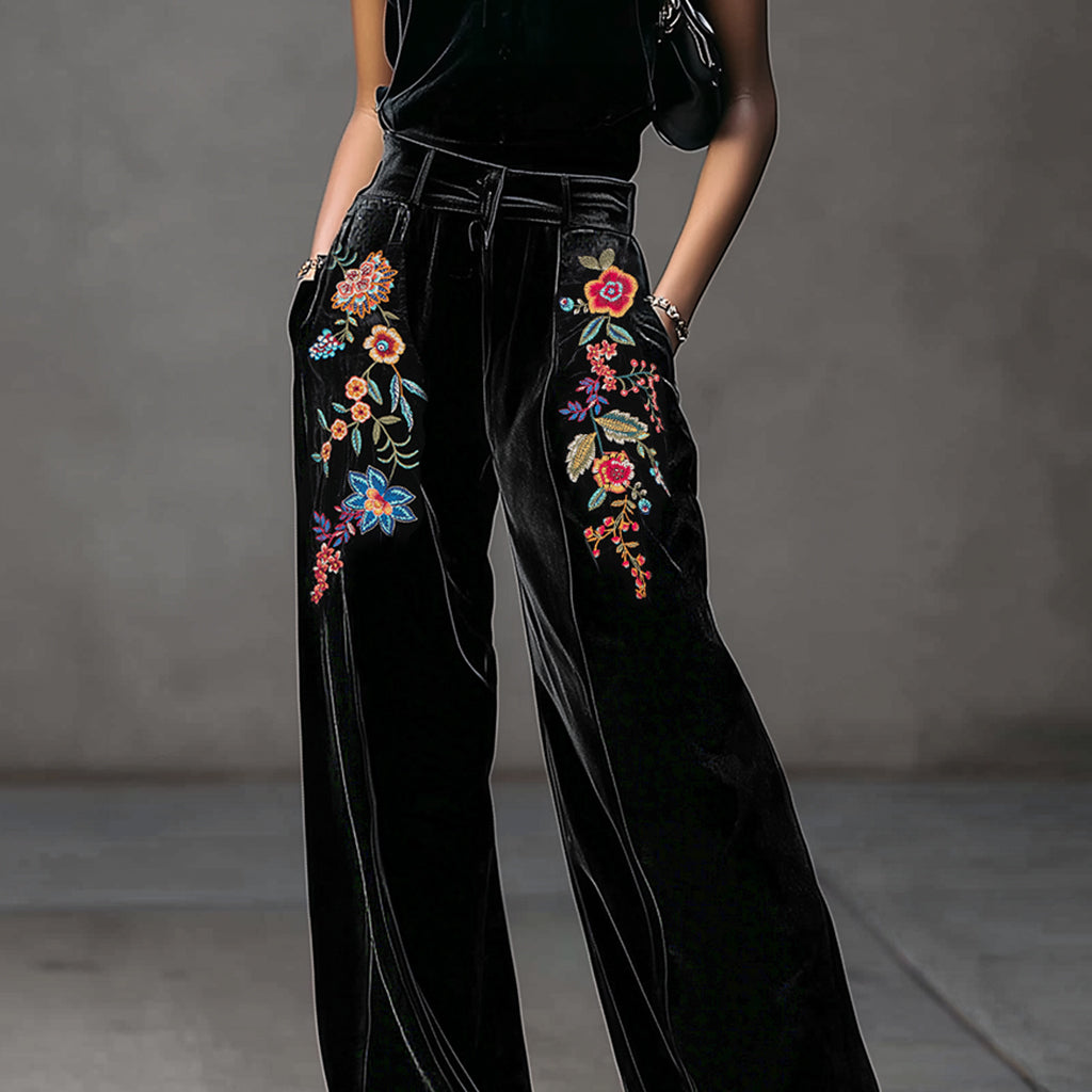 Ursime Velvet Floral Embroidery High Waist Pocket Wide Leg Pants