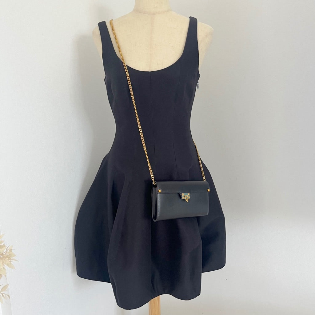 Valentino Garavani's Rockstud Wallet on Chain is a beautiful and luxurious accessory. Crafted from textured calf leather and detailed with gold-tone Rockstuds, it features a detachable shoulder strap and card holders that provide the perfect balance of style and practicality.
