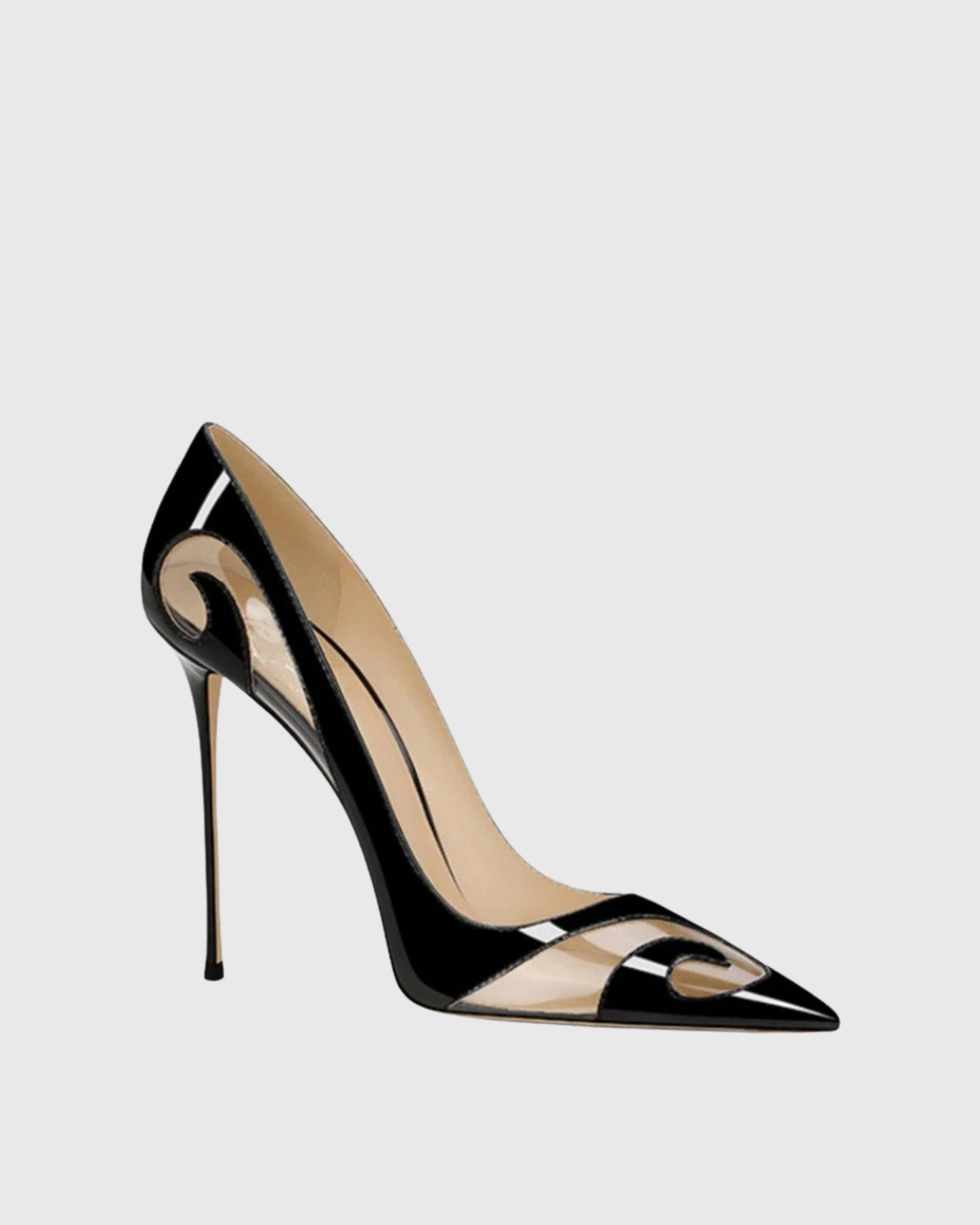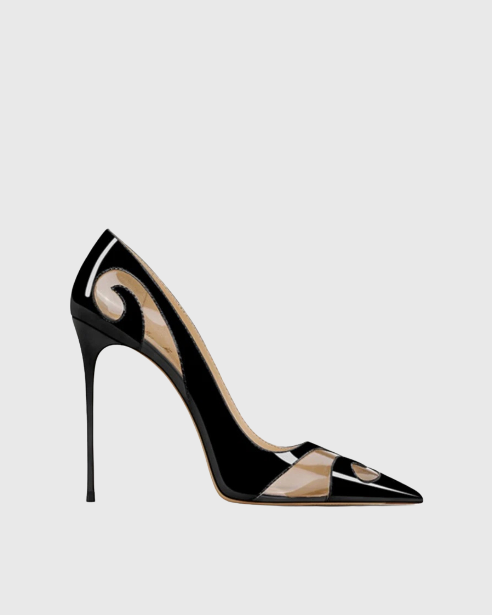 Step confidently with the Varda PVC Panel Pumps in Black. These sleek pumps combine modern design with durable PVC material, offering both style and lasting wear. Their versatile black finish complements any outfit, making them perfect for work or evening occasions. Experience comfort and elegance in one pair that elevates your look effortlessly.
