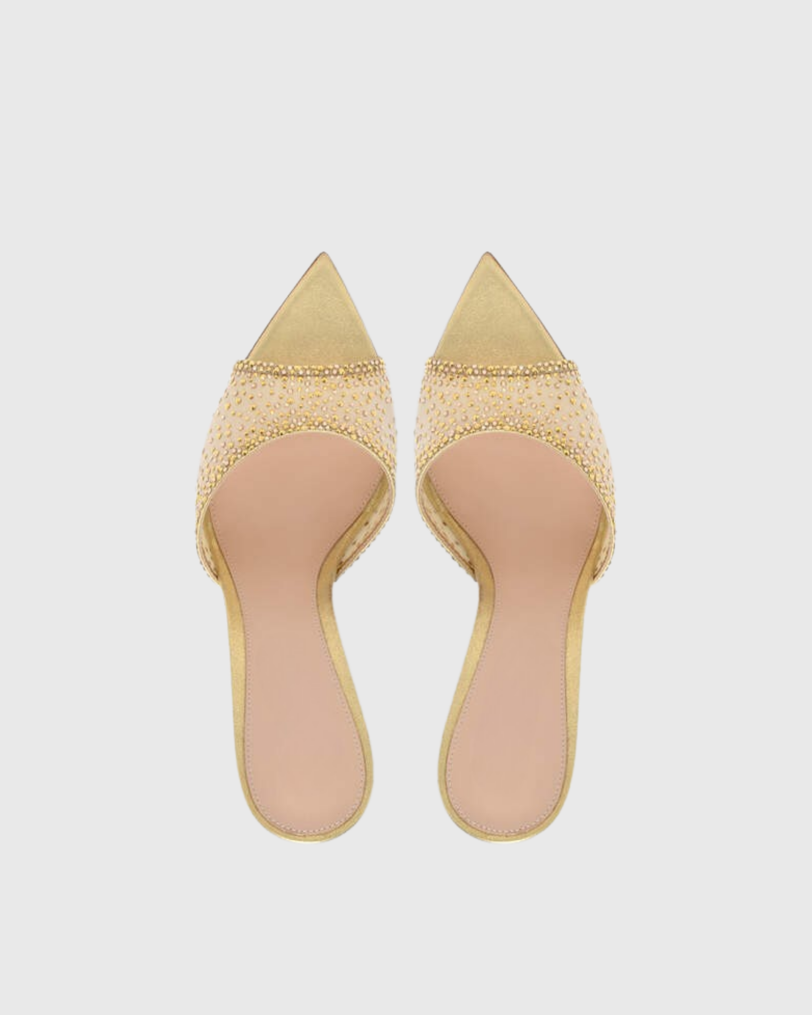 Step into elegance with the Vasha Rhinestone Mesh Slippers in Gold. These stunning slippers combine shimmering rhinestones with breathable mesh, offering both dazzling style and comfortable wear. Perfect for adding a touch of glamour to any outfit, they effortlessly elevate your look while keeping your feet cool and light. Make every step shine with these eye-catching gold slippers designed for confident, fashion-forward moments.