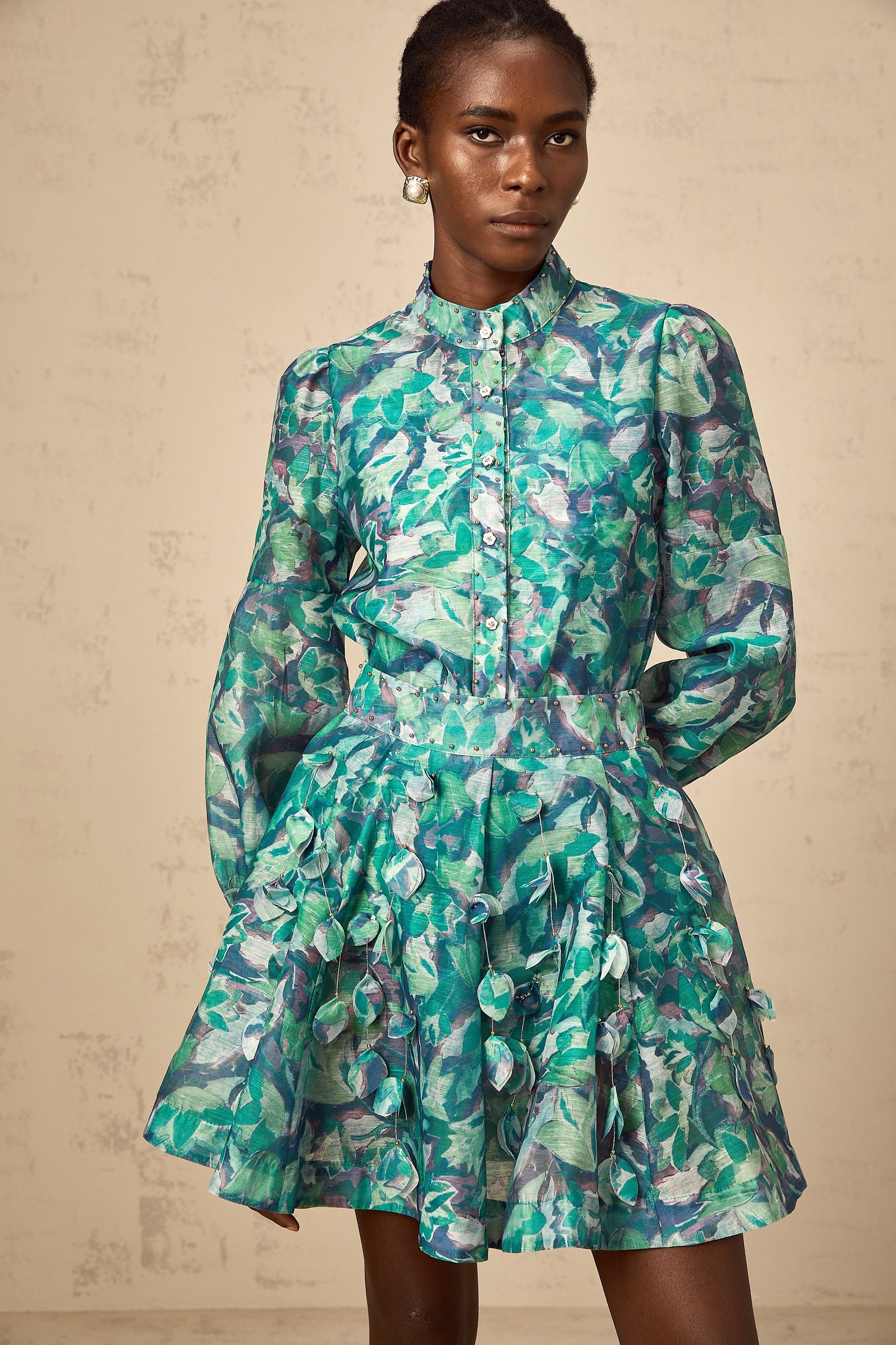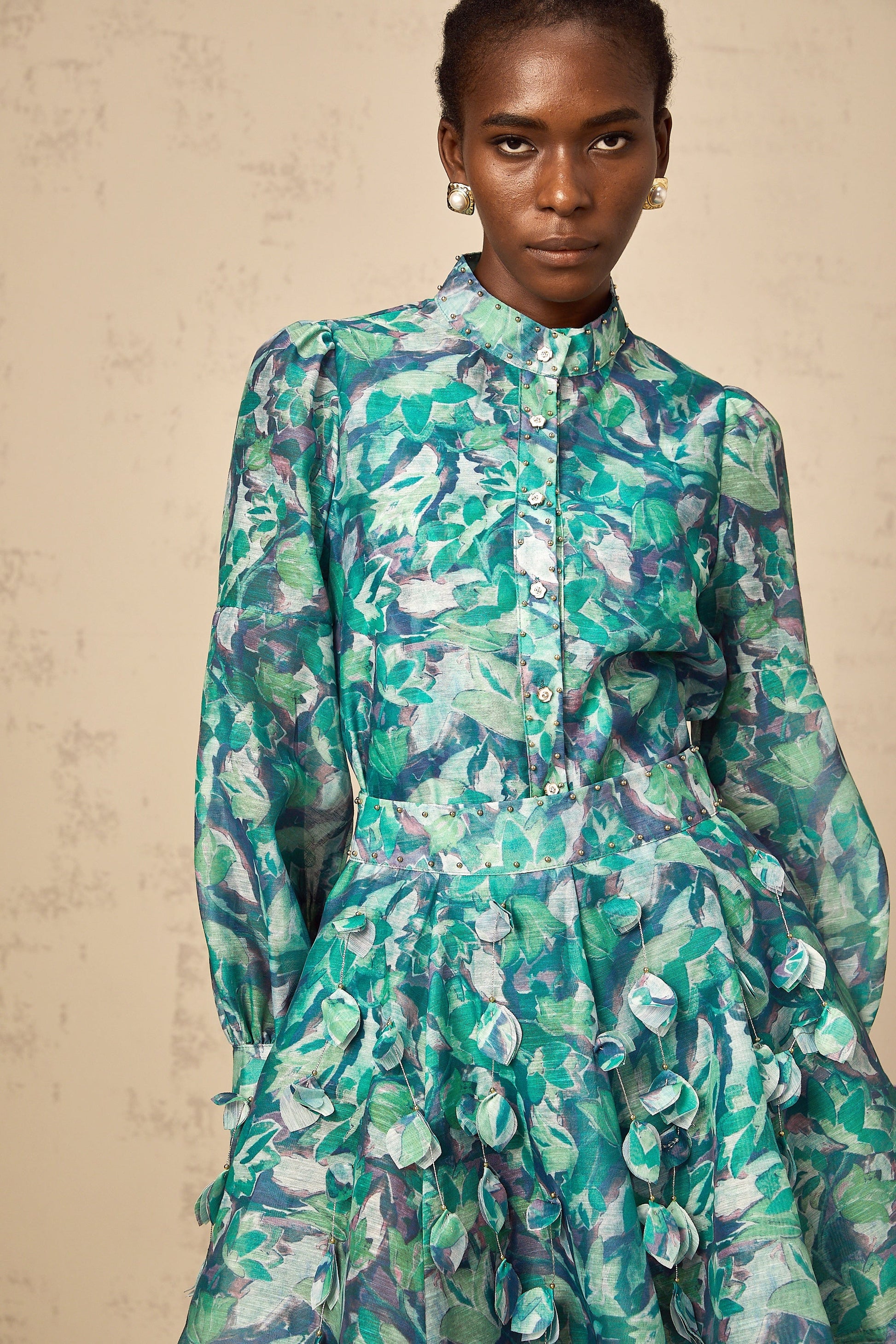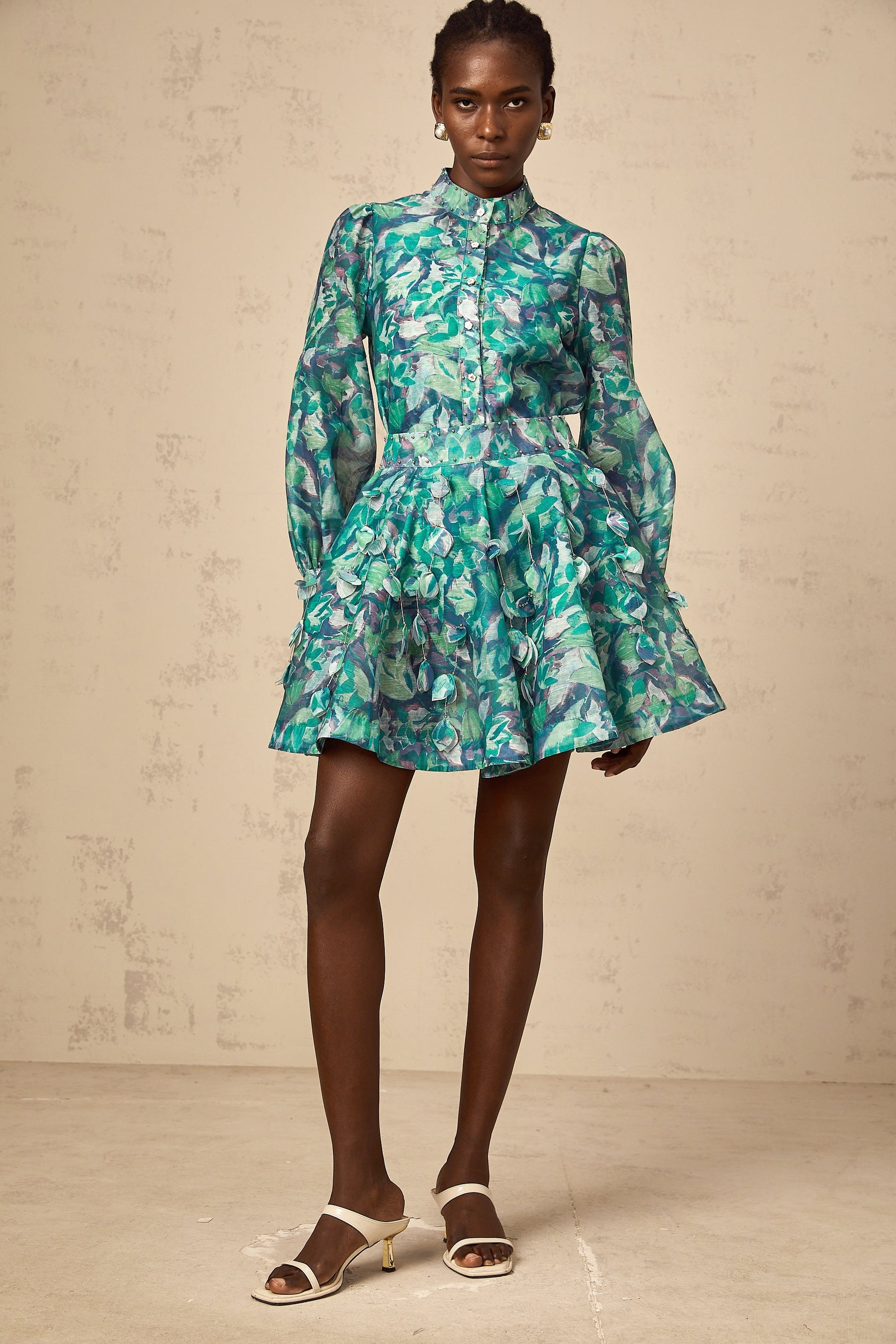Véronique green 3d-petal blouse & skirt matching set