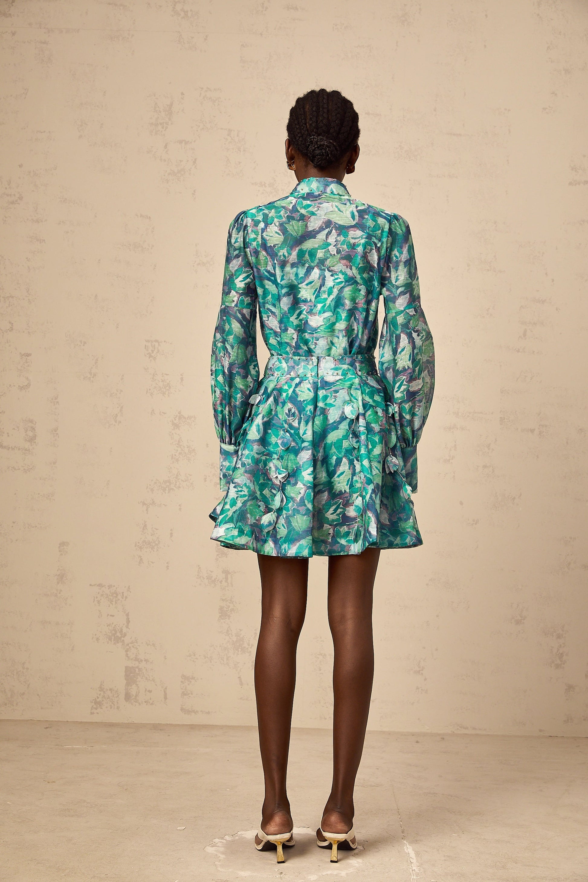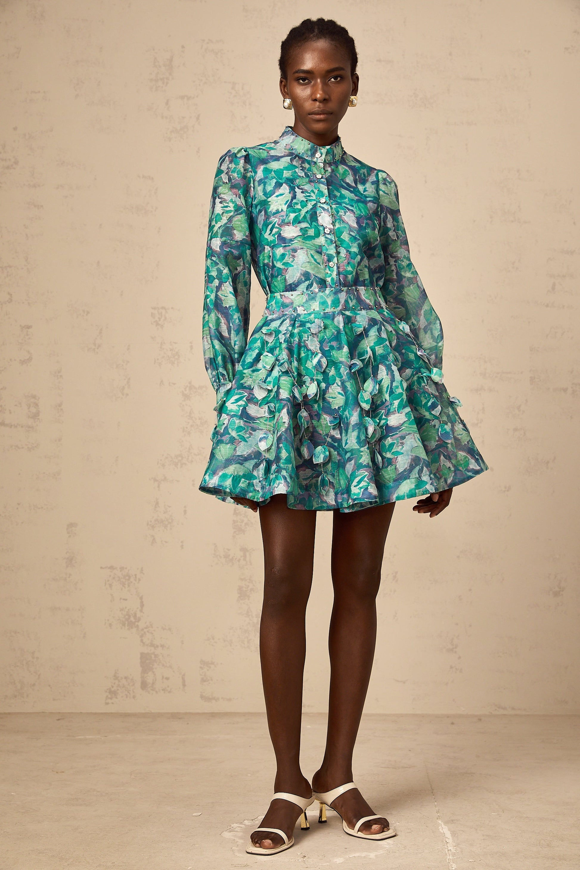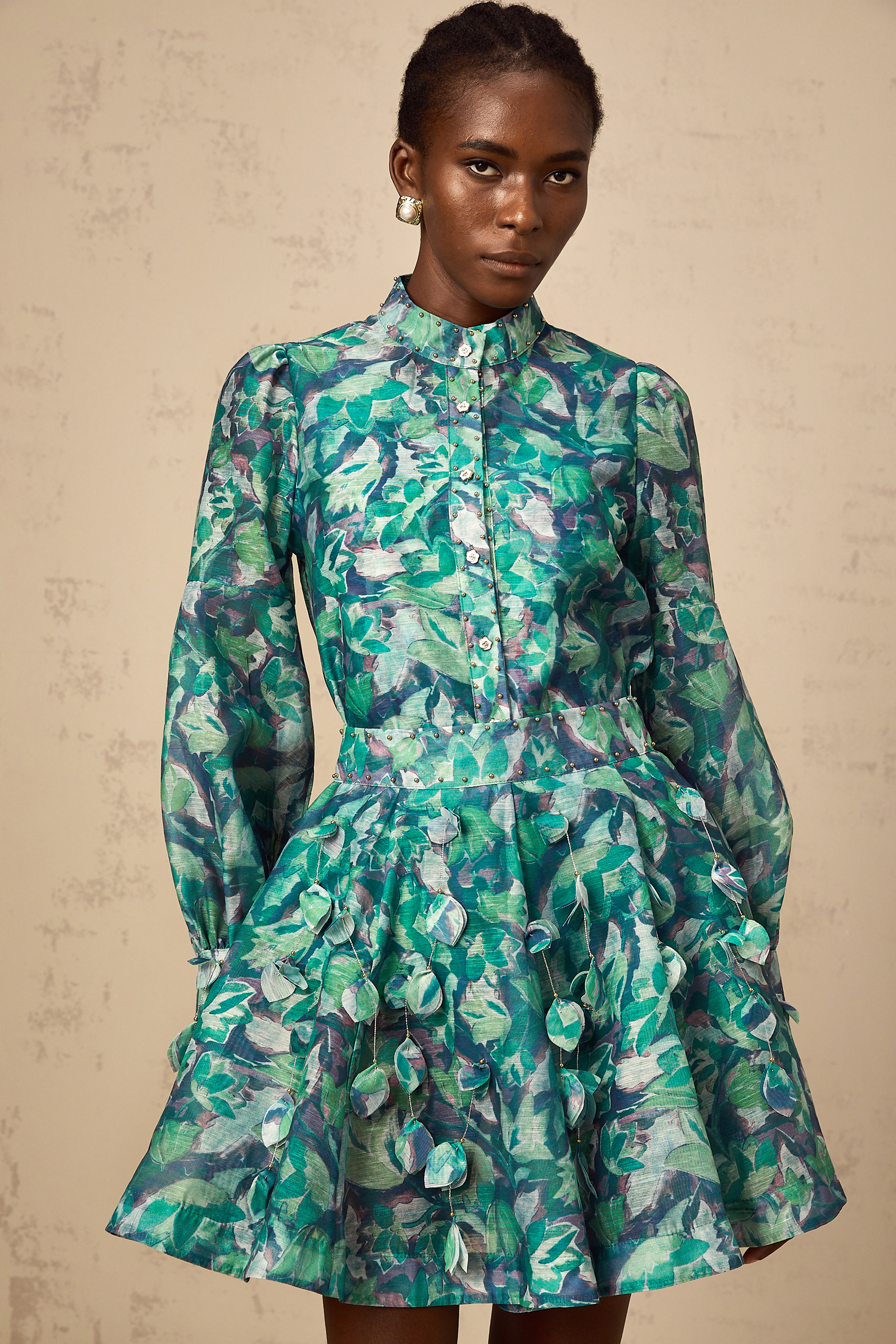 Véronique green 3d-petal blouse & skirt matching set