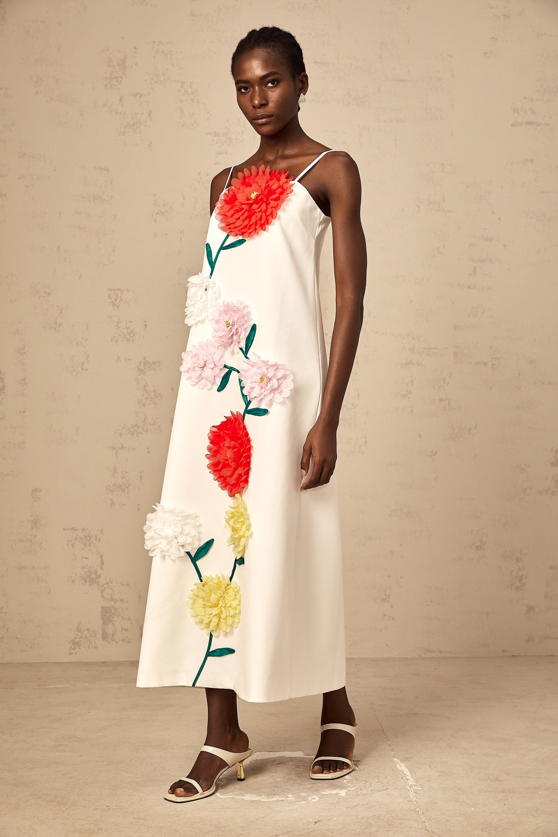 Véronique white 3d-petal sleeveless midi dress