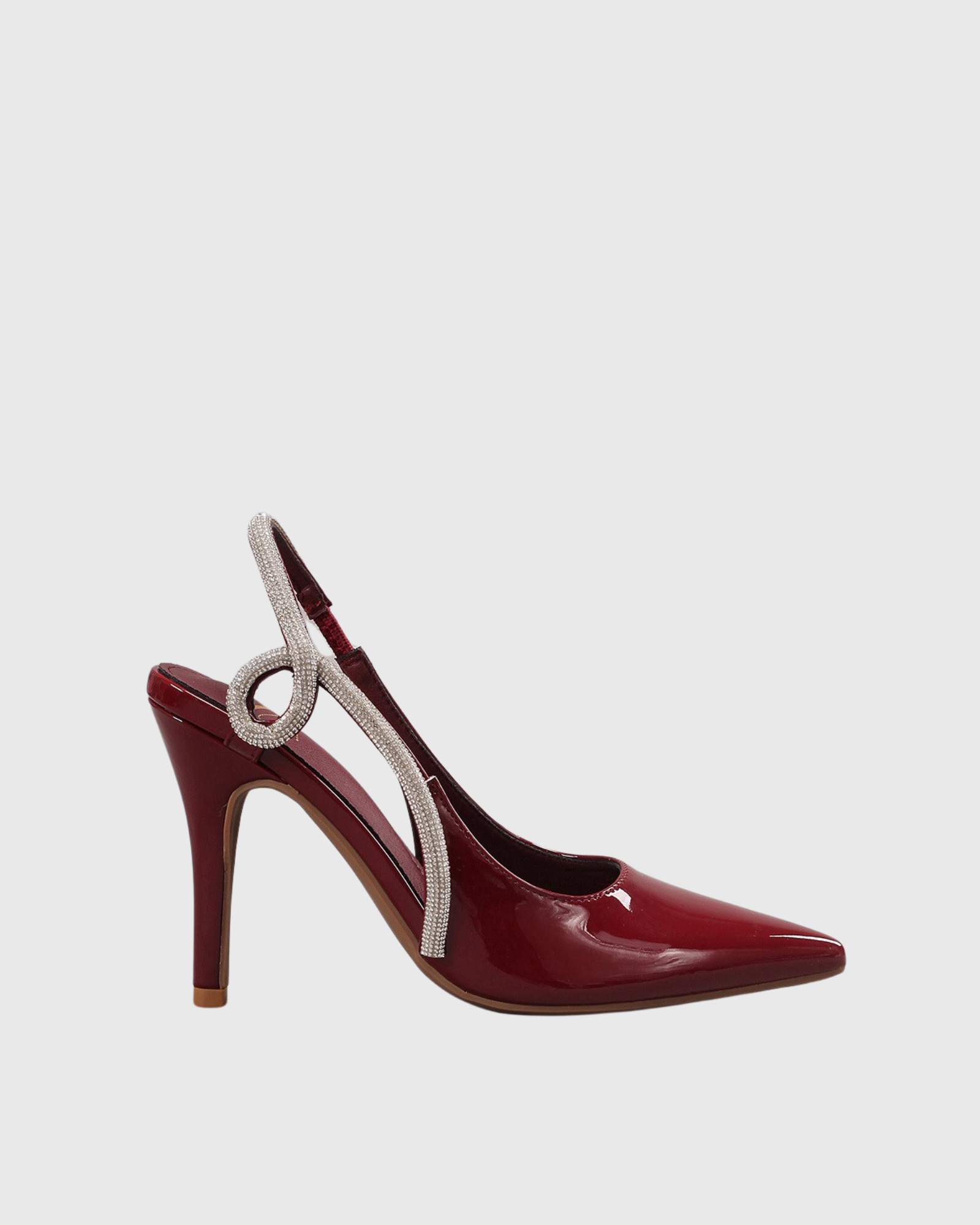 Step into elegance with the Xuxa Rhinestone Slingback Pumps in Wine. Featuring a rich wine hue and dazzling rhinestone accents, these pumps add a touch of sparkle to any outfit. The slingback design provides a secure yet comfortable fit, perfect for all-day wear. Elevate your style effortlessly with shoes that combine glamour and comfort in one stunning package.