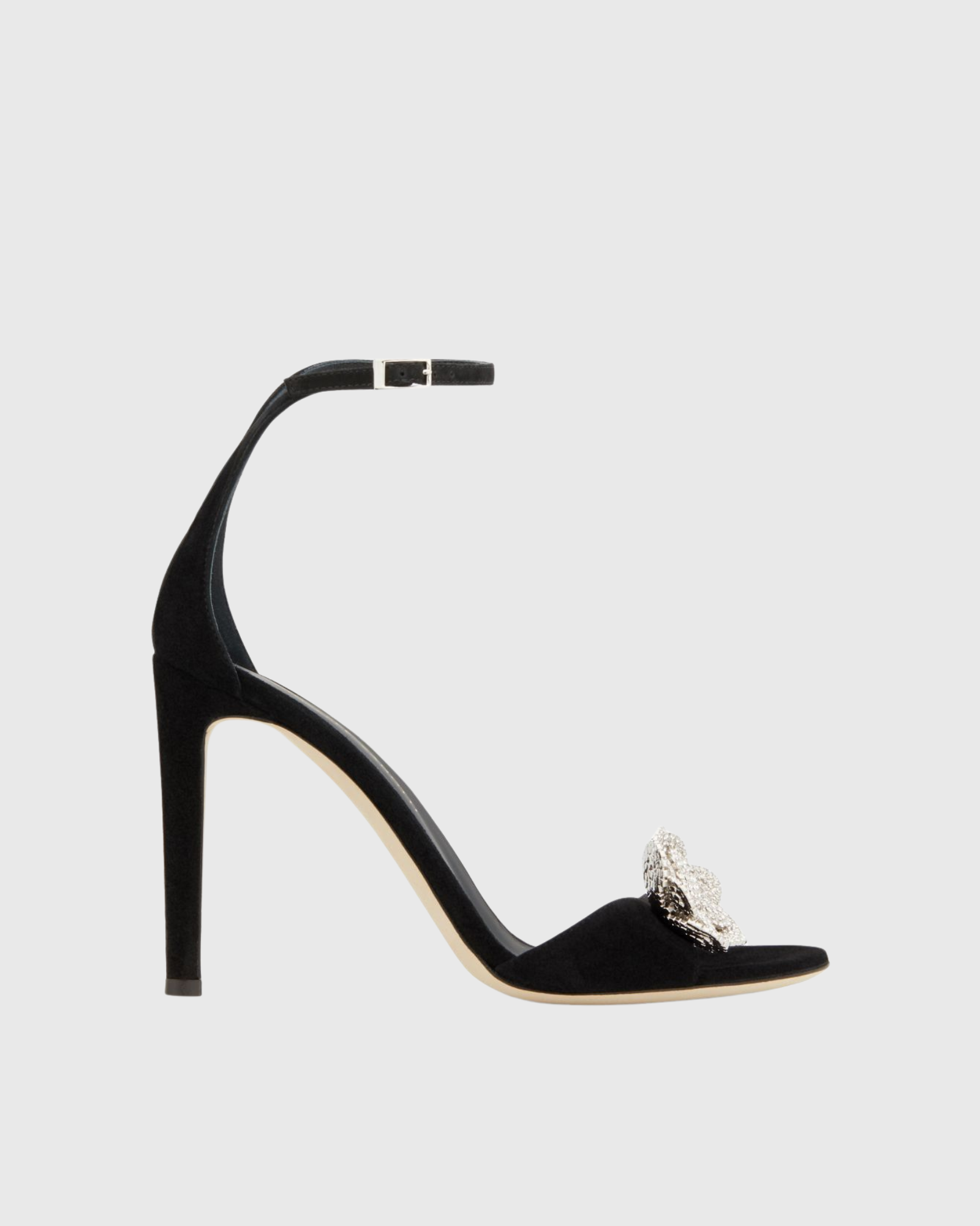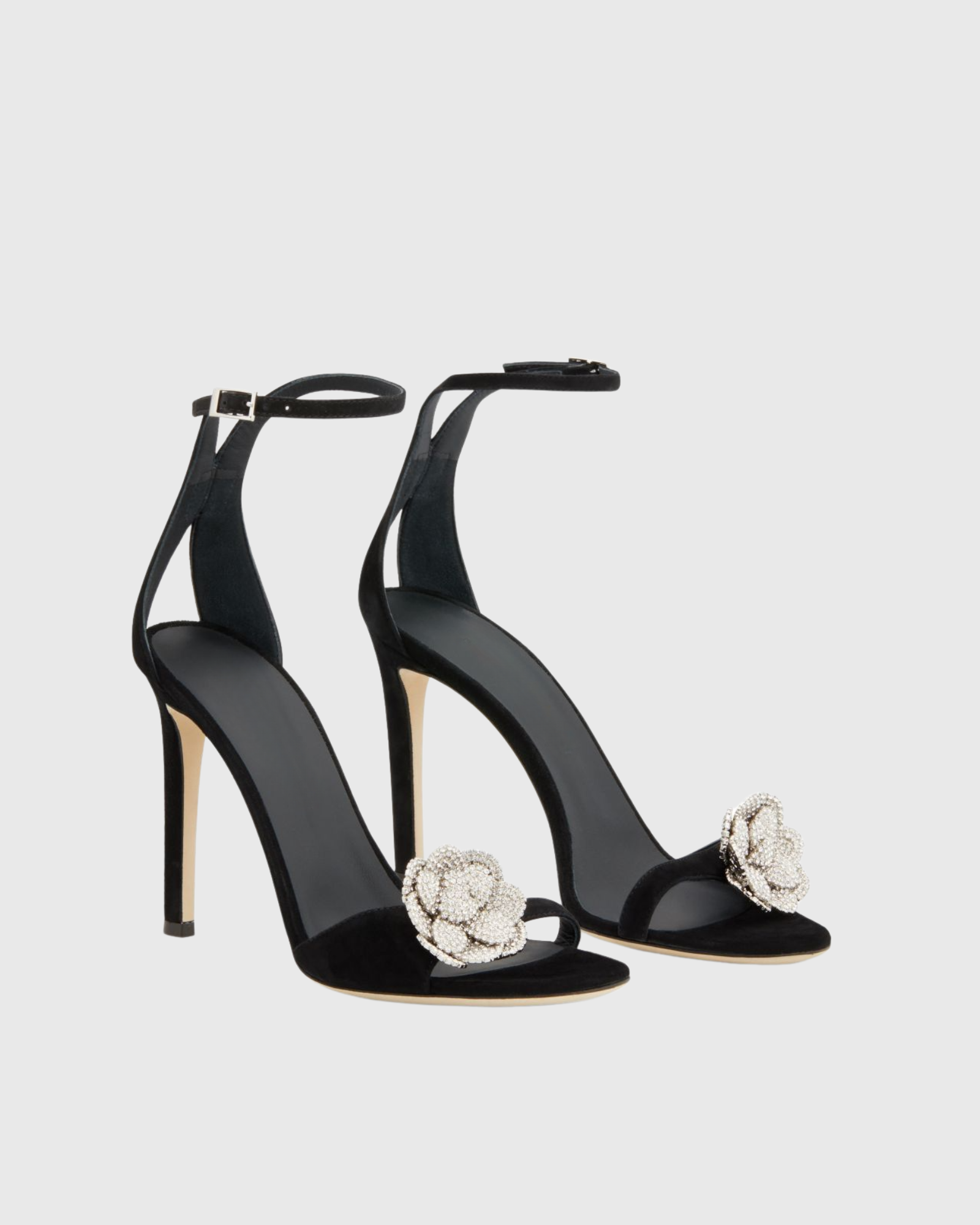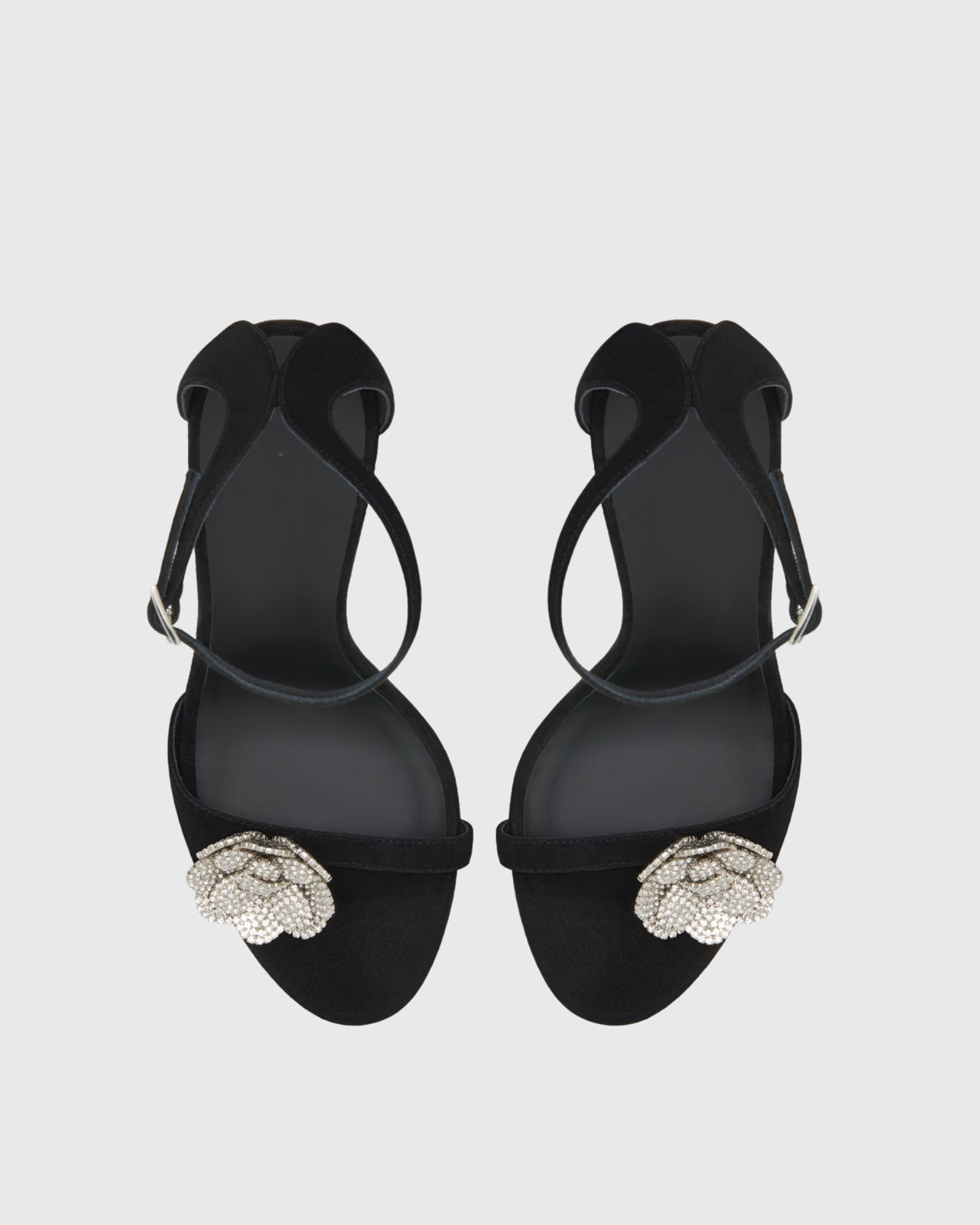Transform any outfit into a dazzling ensemble with Yale Rhinestone Camellia Strap Sandals in Black. Featuring sparkling rhinestones and elegant camellia straps, these sandals will elevate your style and make you stand out in any crowd. Perfect for a night out or special occasion.