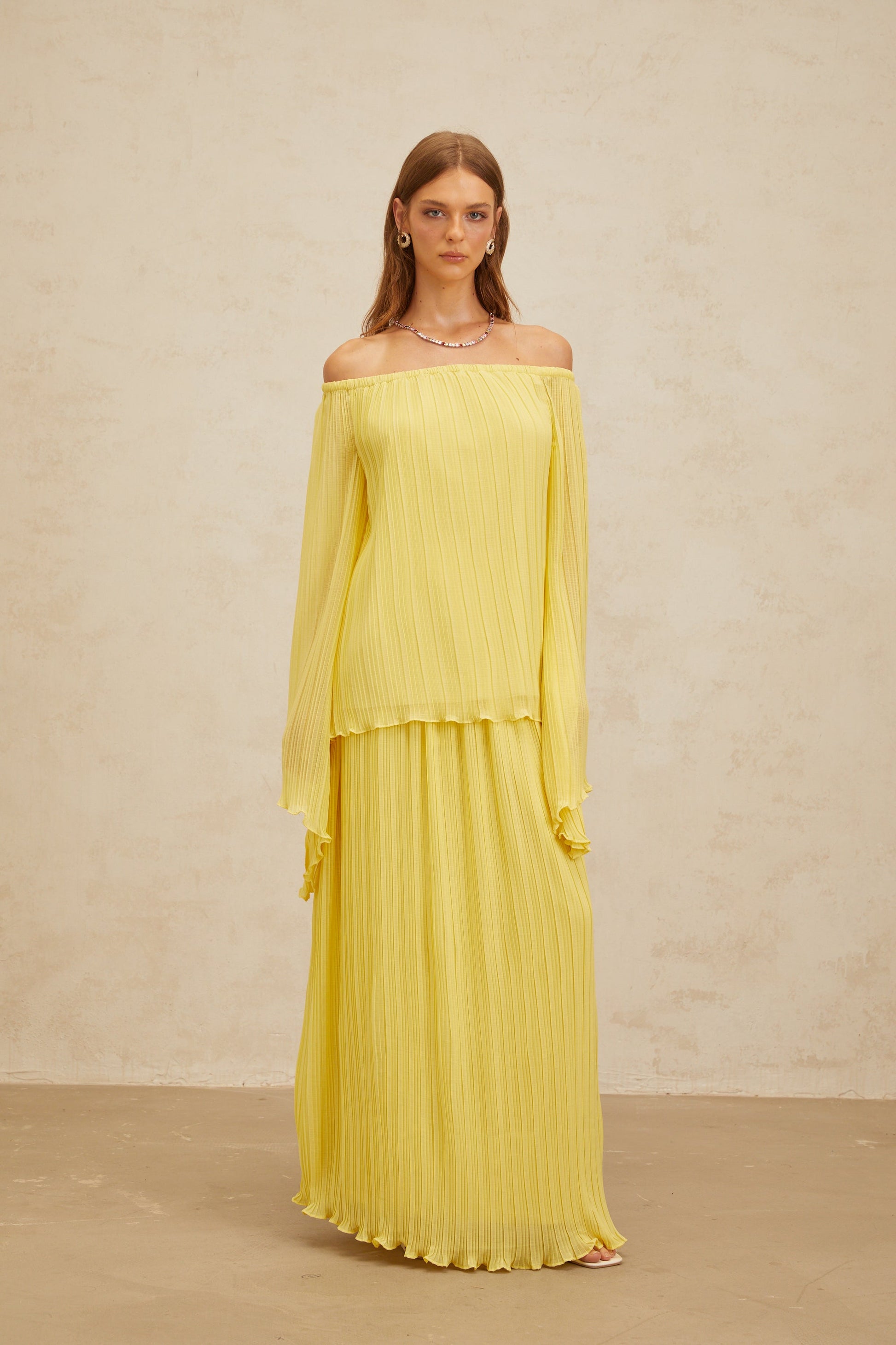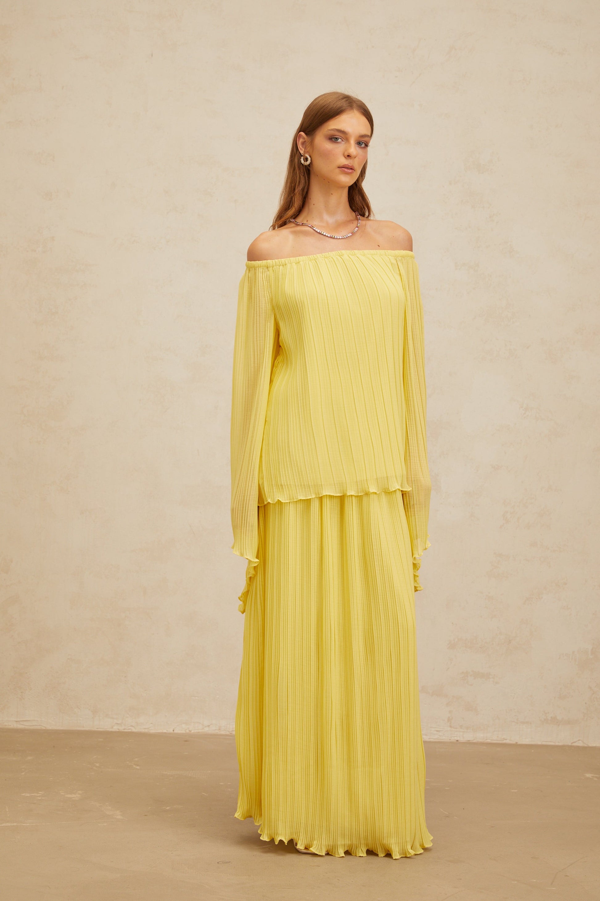 Yseult Yellow Pleated Casual Blouse & Skirt Set