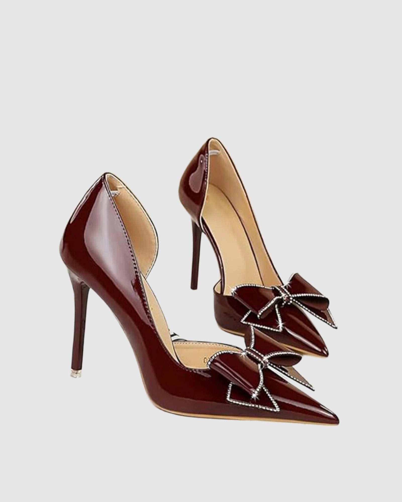 Introducing the Zamora Rhinestone Bow Patent Leather Pumps In Wine. Elevate your style with these elegant pumps featuring a sparkling rhinestone bow. Made with high-quality patent leather, these pumps are perfect for any special occasion. Show off your unique fashion sense with the stunning wine color.