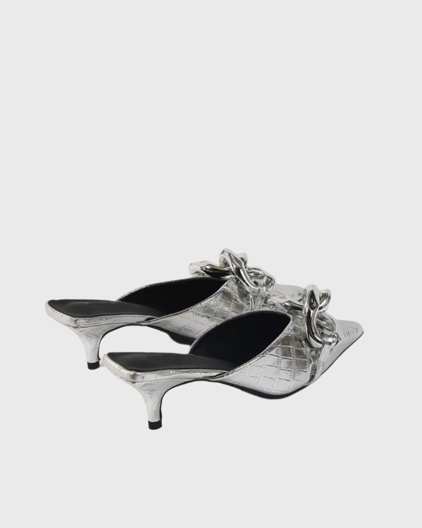 Get ready to turn heads with our Zaria Chain Crocodile Texture Mules In Silver! These stylish and eye-catching mules feature a striking crocodile texture and a silver chain detail, making them the perfect addition to any outfit. With their comfortable fit and unique design, these mules are a must-have for any fashion-forward woman. Elevate your style and make a statement with Zaria.
